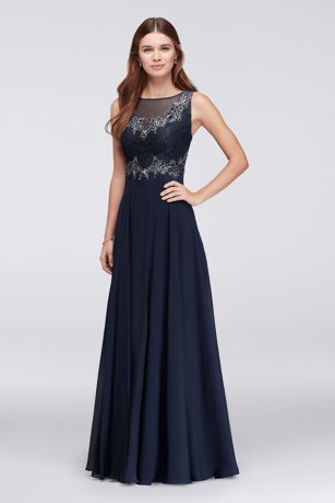 Beaded floral lace appliques glint from the illusion bodice of this long chiffon bridesmaid dress, creating a softly romantic look.