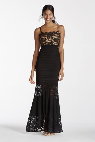 - Floor length banded skirt features sultry illusion lace panels.