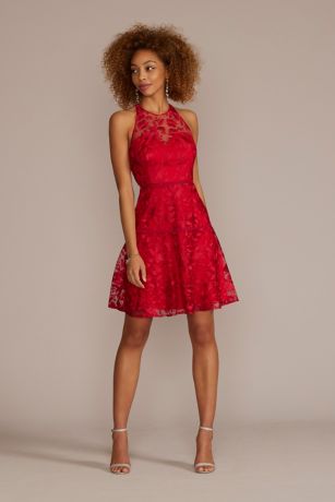 Striking the perfect balance between flirty and fun, this A-line features allover floral lace that stands out atop the illusion halter neckline.