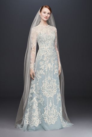 Incorporating color into your wedding day look is an of-the-moment bridal trends. This Oleg Cassini gown features a long-sleeve, lace-appliqued tulle sheath that sits beautifuly over a strapless blue column. The subtle sparkle of sequins and special details like buttons at the wrists and back make this modern take on an opulent dress truly breathtaking.