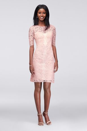 The picture of elegance, this slim sheath dress is covered in lace and finished with scalloped sleeves.