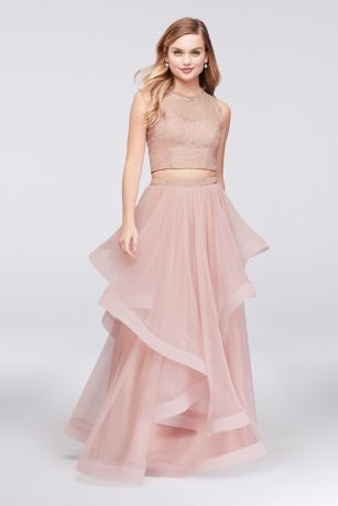 Beautiful filigree lace creates the sleeveless high-neck, illusion bodice of this romantic, two-piece prom dress, as horsehair trim adds dramatic volume to the tiered ball gown skirt.