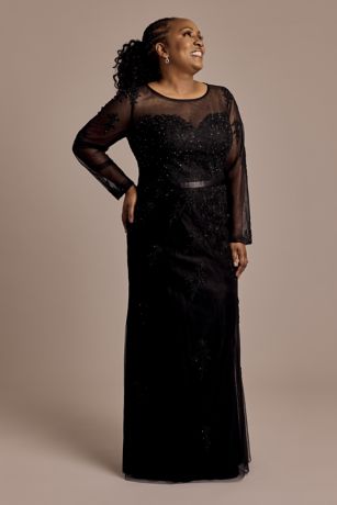 Exemplify modern sophistication with illusion long sleeves and glamorous appliques. This fit and flare dress is perfect for mothers of the bride or groom!