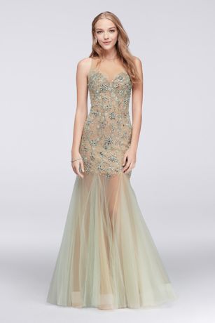 Bedecked with gems and jewels, this illusion gown glows with mega-watt sparkle. The fitted illusion bodice and softly flared tulle skirt are tinted with a hint of mint. This style is exclusive to David's Bridal.