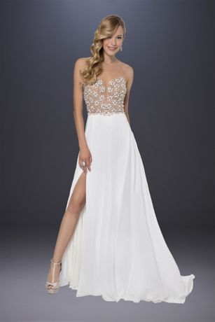 A beaded illusion mesh bodice creates the look of a plunging sweetheart neckline on this sheath wedding dress. The flowy chiffon skirt features a front slit for showing off fun footwear.