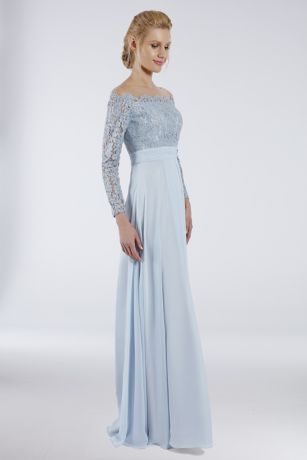 This long sleeve chiffon gown's beaded lace bodice has an elegant off-the-shoulder look, and features a barely there illusion inset for perfect coverage.