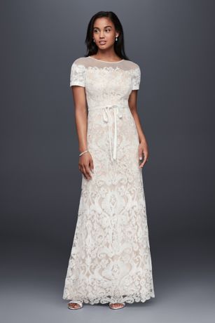 This strech-lace sheath dress's neutral lining makes its corded swirls and illusion neckline even more striking. A slim grosgrain sash adds a touch of sweetness.