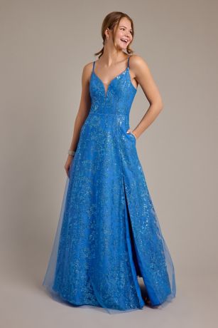 With patterned sequins swirling across this A-line dress, you'll steal the show at prom.