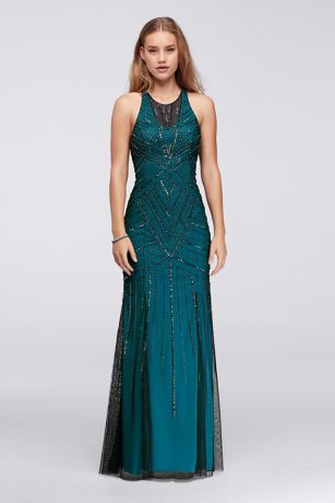 Art Deco-inspired beading adds a timelessly chic touch to this illusion gown: The precise lines enhance the open-back sheath's sleek silhouette.This style is exclusive to David's Bridal.