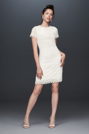 Looking for a charming option for your bridal shower or rehearsal dinner? Try this refreshing crochet short sleeve dress, trimmed with sheer Venice lace at the sleeves and hem. A cutout in the back completes the look.