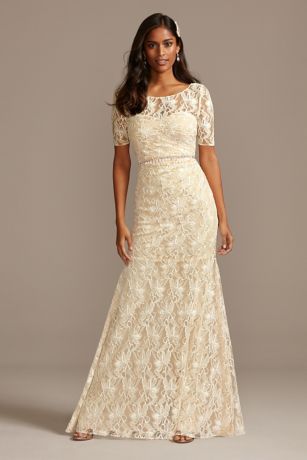 A sheath silhouette with a sweetheart neckline sits beneath a layer of a unique, floral lace to create this stunning wedding dress. Illusion detail at the neckline, short sleeves, and keyhole back provides an extra touch of glamour to the dress while subtle ruching at the waist adds curve-enhancing detail to the bodice.