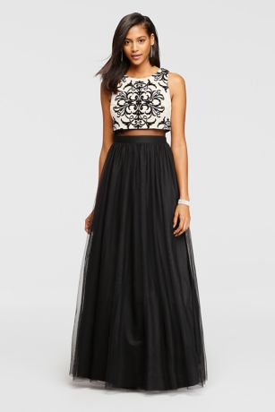 Make a dramatic statement in this two-piece ball gown. The cropped tank is designed with a velvet baroque pattern. A sheer inset connects the crop top to the full ball gown skirt.