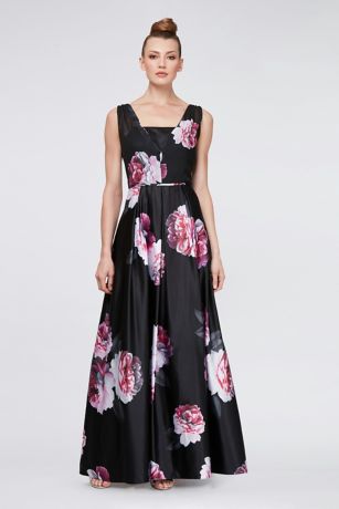 The deep V-neck of this flattering mikado gown is inset with an illusion panel, creating an interesting focal point along with a bold, blooming print.