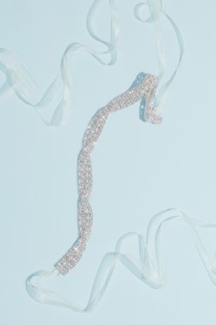 Infinity loops are formed by twisting crystal bands framed with rows of pave crystals. Finished with gossamer organza ribbons to create an eye-catching sash that adds flair to any wedding dress.