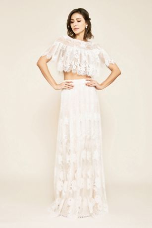 Wear this ornate lace top on your wedding day and beyond. Featuring flutter sleeves and a flowy cropped silhouette, it's a refreshing alternative to a traditional wedding dress. Pair it with the matching skirt to complete the look.