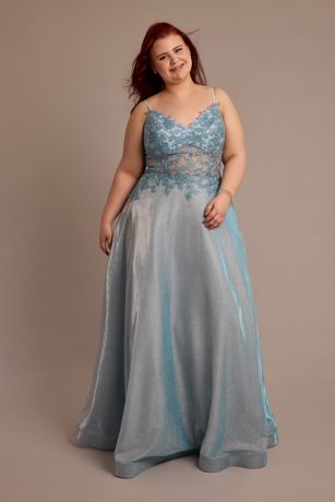 This dress combines sexy and sweet elements, so you can show off your one-of-a-kind prom style! Iridescent metallic fabric is trending, and the voluminous ball gown skirt looks so romantic. An illusion bodice and a lace-up back ensure heads will turn.