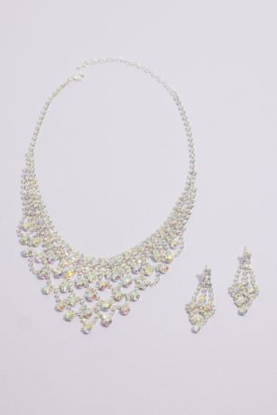 Shimmering iridescent beads are suspended from a network of draping crystals on this quince-perfect necklace and earrings set.