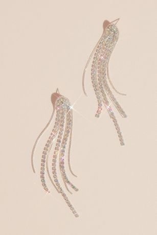 Individual strands of brightly-shining iridescent rhinestones and metal chains form the dangling fringe on these sparkling earrings.