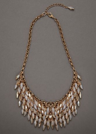 - Necklace features iridescent beading and chain detail.