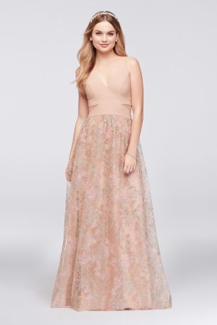 Multi-colored pastel branches are embroidered on the voluminous mesh skirt of this jersey-bodice ball gown. Side illusion cutouts add extra detail.