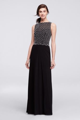 A flowy skirt makes this long jersey dress easy to wear, while the caviar-beaded bodice brings the glamour.