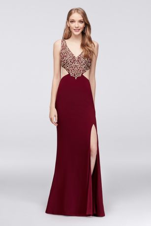 This slinky stretch-jersey sheath, with a plunging cutout halter bodice, is topped with a filigree applique of sparkling stones.
