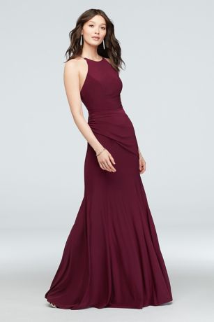 This high-neck jersey dress keeps it sleek and subtly sexy with crystal-embellished crisscross straps and draping at the hips.