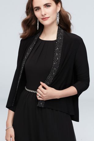 Dazzling and sophisticated, this rhinestone lapel jersey jacket provides a bit of coverage and eye-catching flair.