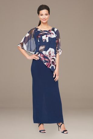 An asymmetrical floral chiffon capelet drapes over this jersey sheath to create a look that's both modest and modern.
