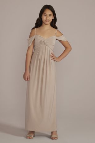 Thanks to the softest jersey fabric, this junior bridesmaid dress is cute and comfortable, with draped swag sleeves, adjustable spaghetti straps, and a knot detail on the bodice.