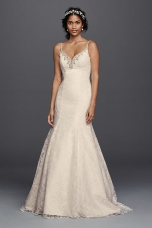 Glamorous and alluring, this lace trumpet wedding dress follows your figure's curves. The crystal embellished V-neckline and beaded spaghetti straps add a dose of sparkle.
