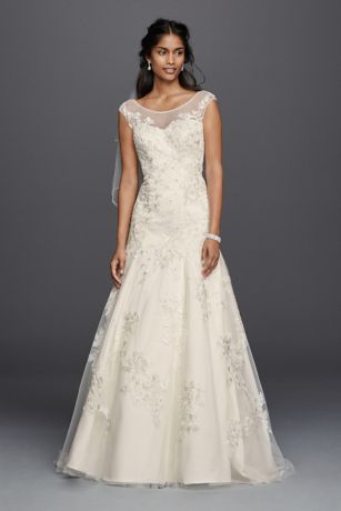 This A-line wedding dress was designed with an illusion neckline and cap sleeves to provide demure coverage. Shimmering satin under a layer of tulle creates a subtly glamorous effect.