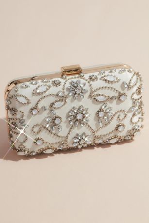 Elegant jeweled flowers bloom and vines flourish on this petite minaudiere clutch. Lined in satin; holds your phone.