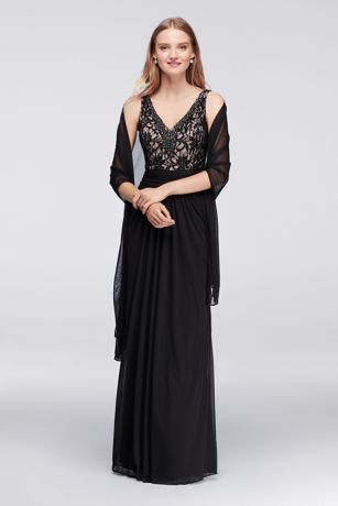 Jeweled Lace and Ruched Mesh V-Neck Long Dress