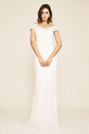 Mixed, tactile lace patterns adorn this stunning wedding gown from sheer illusion neckline to dainty cap sleeves to chic sheath skirt.