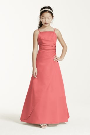 This long satin ball gown has a overlay and ruching at the side seam. The spaghetti straps keep this dress simple. This dress will look great with our Bridesmaids ball gown styles. This style features an adjustable fit for added flexibility and comfort with fewer alterations.