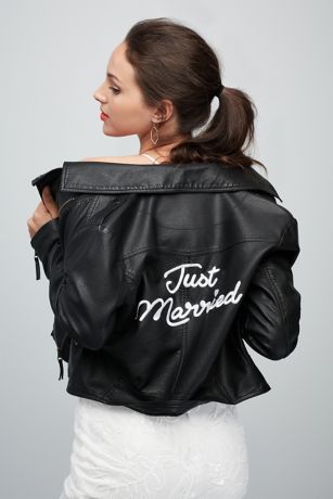 This embroidered vegan leather jacket is the perfect piece for the fashionista bride who loves a rock-and-roll look. A moto silhouette, accent zippers, and embroidered \"Just Married\" on the back add an extra touch of cool.