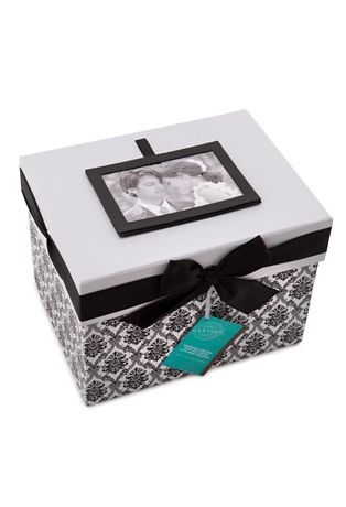 This beautiful white with black damask card box will look elegant on your gift table. It is made of sturdy bookboard with an overlay of a smooth paper, interlaced with a black satin Bow and Picture Frame that stands on top of the Box. Simply place your 4" x 6" photo in the frame! Great for Bridal Showers, Wedding Cards, Decorations, etc.