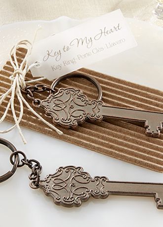 What a lovely invitation to experience an earlier time, when practically everything was romantically designed. Open your heart and make a long-gone ambiance come alive at your event with these antique key-inspired keychain favor. Charming Victorian-style key and key chain with antique-bronze finish. Gift presentation card is corrugated cardboard with a natural robe bow and vellum hangtag.
