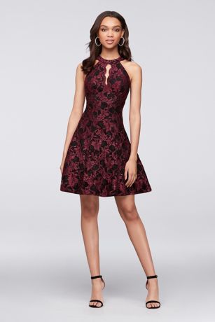Sleek and simple, this glitter lace fit-and-flare dress is detailed with a scalloped keyhole neckline.