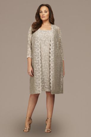 This two-piece plus size set includes a gorgeous knee-length lace shift dress and a matching jacket.