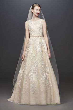 This stunning lace gown features a high neck illusion tank bodice and an A-line skirt adorned with 1,000 beaded 3D flowers. The metallic sparkle tulle will bring a touch of fairydust magic to your big day. The gown is finished with an open low back, and pockets for all things new, borrowed, and blue.