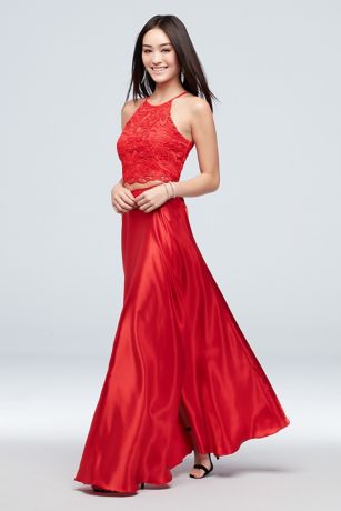 A cropped lace high-neck top pairs beautifully with a floor-length charmeuse A-line skirt on this two-piece ensemble.