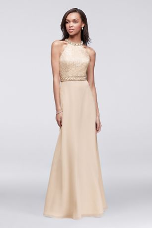This sophisticated chiffon gown features a lace bodice trimmed in gems at the neckline and waist. This style is exclusive to David's Bridal.