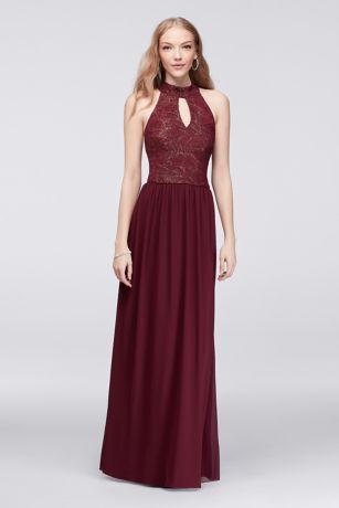 On this long chiffon dress, a gilded lace halter bodice with a keyhole makes a pretty first impression, but the strappy, banded back creates a new kind of allure.