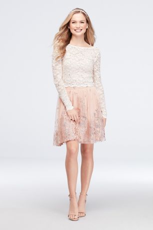 A long-sleeve lace top and a glittery floral-print skirt make this two-piece dress a romantic choice for homecoming and other big events.