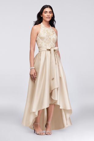 The classic halter-style bodice, with a high neck and a back tie, always feels elegant, particularly when crafted from pretty lace and paired with a full, high-low mikado skirt.