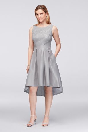A lace bodice and box-pleated high-low shantung skirt gracefully elevate a simple fit-and-flare dress.