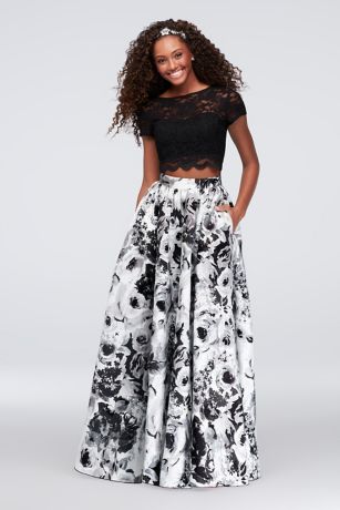 The classic ball gown gets a cool upgrade with this two-piece set, featuring an illusion lace short-sleeve crop top and floral-printed mikado skirt.