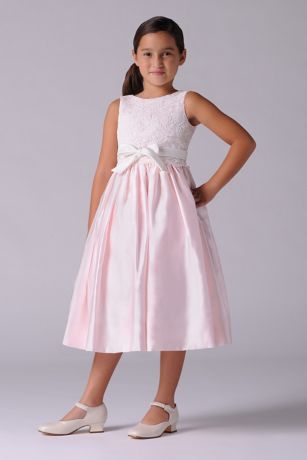 This satin flower girl dress is so sweet, with a pretty lace bodice and a removable ribbon sash that ties in the front
